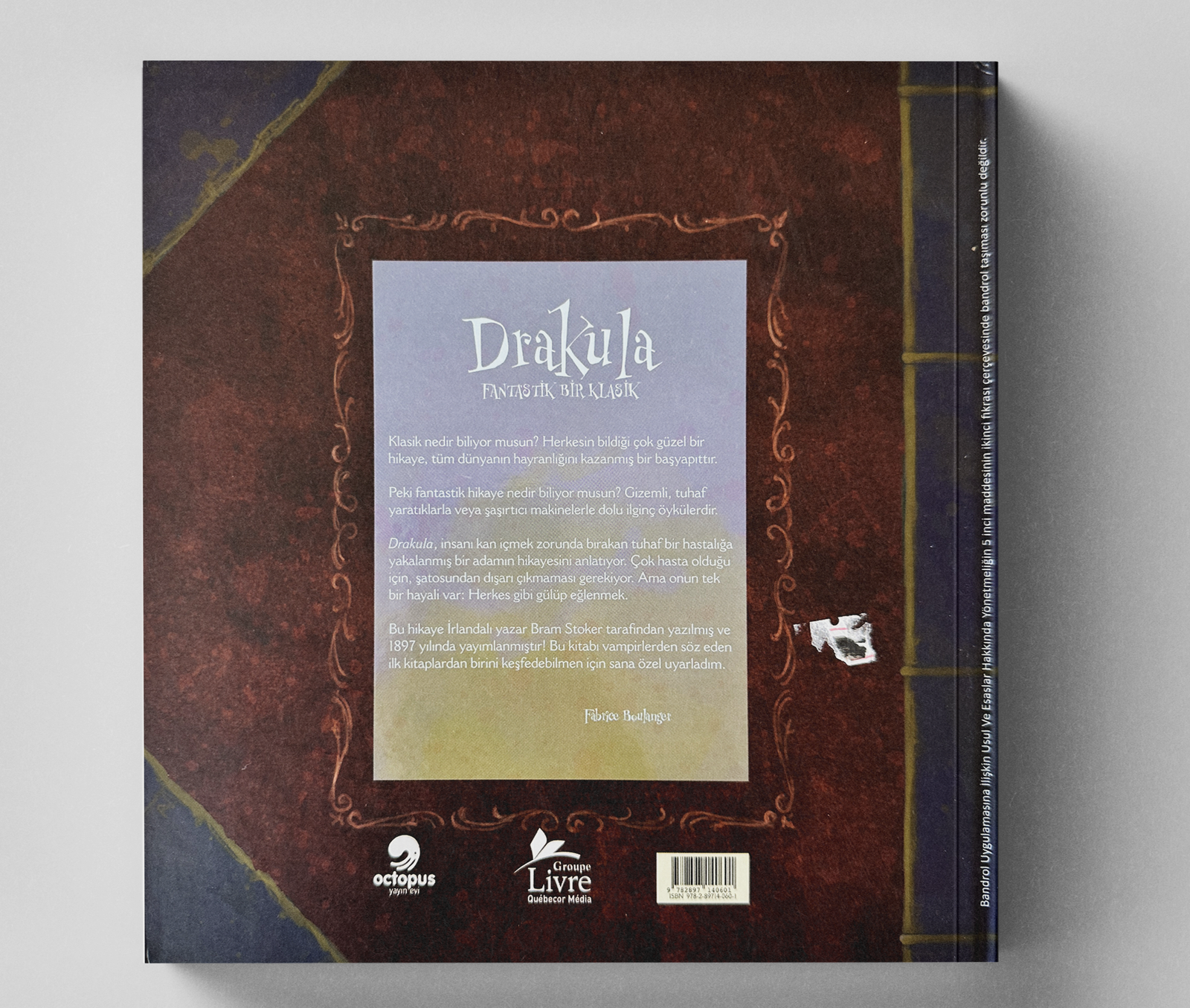 Drakula, Bram Stoker tarafından kaleme alınan klasik romandan uyarlanarak çocuklar için tasarlanmış ve Fransızca dilinde yeniden yazılmış özel bir hikayedir. Şimdi, bu eşsiz dönüştürülmüş eser Türkçe’ye çevrilmiş halde, 6 ila 8 yaş grubundaki çocuklar için uygun hale getirilmiş olarak sunuluyor. Çocuklara hem edebi bir mirası tanıtmaya hem de eğlenceli bir okuma deneyimi yaşatmaya yönelik bu kitap, klasik bir hikayeyi yaş grubu gözeterek yeniden anlatıyor.